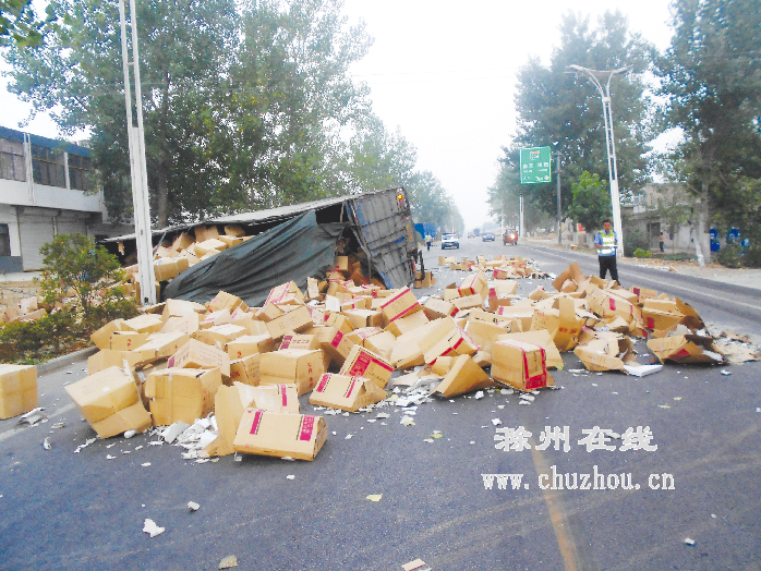 报料内容:近日,凤阳境内307省道与宁洛高速连接线路口东500米处,两辆货车发生碰撞,所载货物侵占大幅路面。