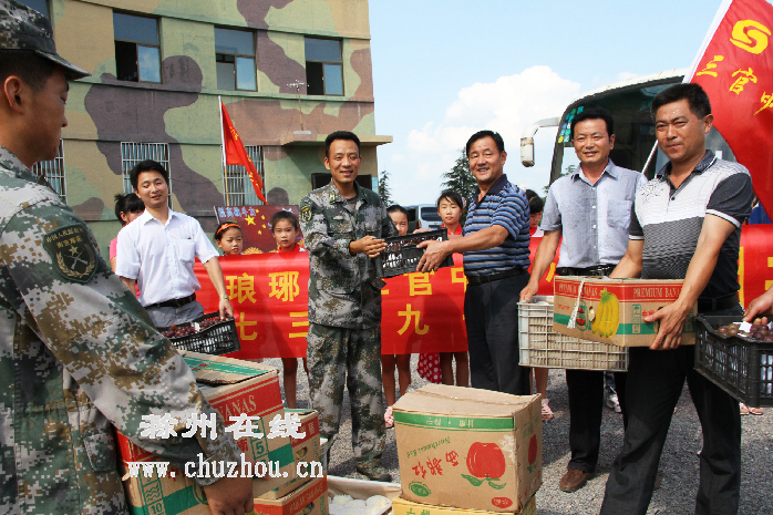 “八一”建军节到来之际,琅琊区三官中心小学部分教师和10多名“留守儿童”来到军民共建单位、驻滁某部综合训练场,为正在训练的部队官兵送去水果和3000元慰问金。 朱永斌摄