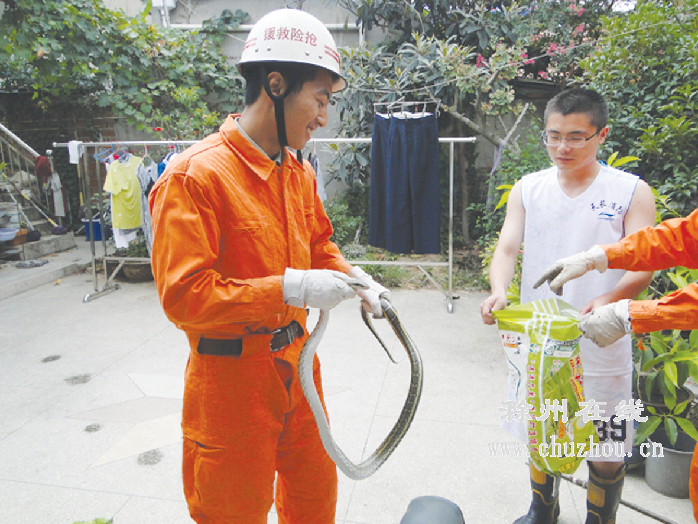 消防官兵接警后赶赴现场,询问得知这条蛇躲在大院的三张旧沙发底下。消防官兵穿戴好护具,将两边的沙发搬开,最后在中间沙发底下发现一条约1米多长的菜花蛇,官兵们利用叉子、铲子等工具将其成功捕捉,随后带到草地上放生。