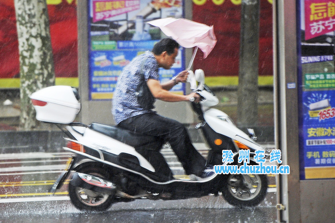 市民在暴雨中骑行。记者 计成军摄