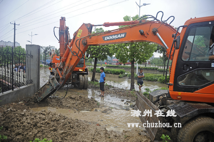 暴雨中,记者沿着滁城以前易积水的区域转了圈,如天大钢管厂、花园路、建行大楼、紫薇北路等。在最严重的天大钢管厂附近,记者看见由于道路积水较深,下水管道排不及,市政部门紧急调来两台钻机临时打开紫薇路至湖心路渠的新通道。随后路面积水快速流入渠道,逐渐消退。