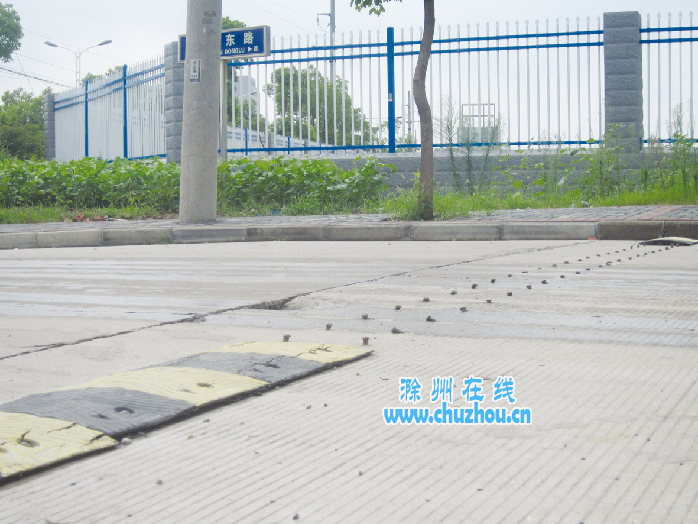 报料内容:滁城花山东路上有一条减速带坏了,露出了一排铁钉,形成了钉子路面。