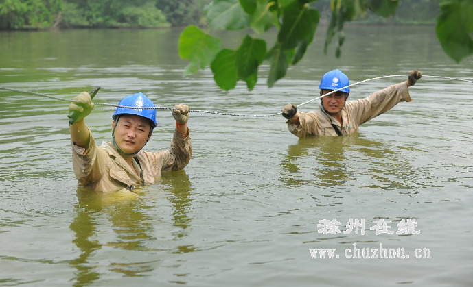 日前,在全椒武岗镇沙石村,电力工人正在涉水架设临时400伏电力排灌线路。受台风影响,全椒境内滁河来水急剧增加,圩区一百多万亩秋粮作物面临受灾。当地供电部门组织12支党员供电服务队,深入辖区对排灌设备进行维修,指导用户对自备发电机和供电线路进行定期试车检查,确保农民生产生活用电不受影响,秋季作物取得丰收。