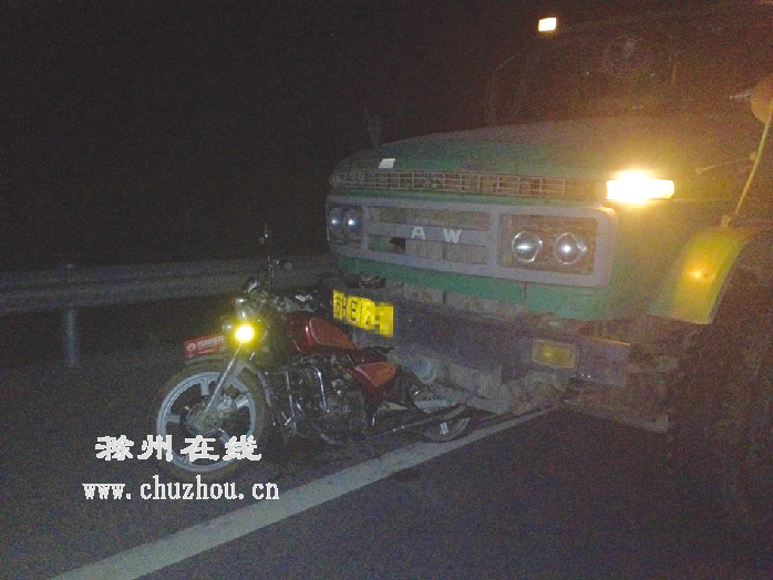 本网讯 近日,国道G205线天长市境内,一辆摩托车被后方一辆货车“咬”住屁股,推行200米后才停下。险象环生的事故,让摩托上的三人经历了惊心动魄的一夜。