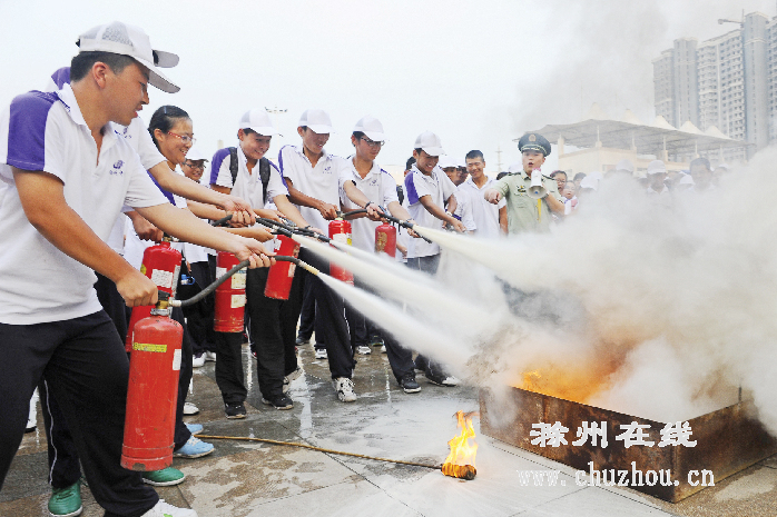 8月29日,滁州中学校园内,高一新生在消防官兵的指导下学习如何正确使用灭火器。