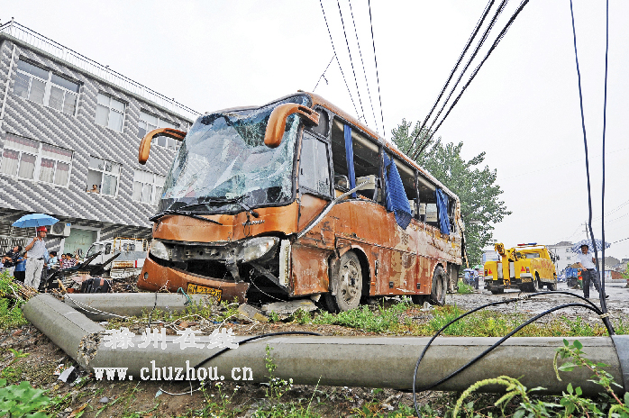 14时15分,记者赶到水口镇桥西村,事故路段已被交警严密管控,所有车辆减速行驶。在大桥西侧约50米处,一辆悬挂来安牌照的“来安-南京”的班线客车,左侧车身因遭遇重击,车窗玻璃、车体碎片满地,车体扭曲变形;客车前脸因正中电线杆而凹陷,电线杆被平推出数米后断成四五截。