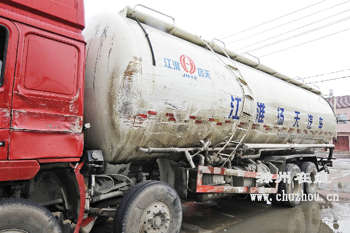 与客车发生刮擦的是一辆悬挂全椒牌照的水泥槽罐车,事故发生后停在桥面,后来被警方引导离开现场。记者随后在水口交警中队门口发现该车,与客车惨状相比,槽罐车伤势较轻,仅左侧倒车镜被挤扁、车身悬梯扭曲,以及多处擦痕。