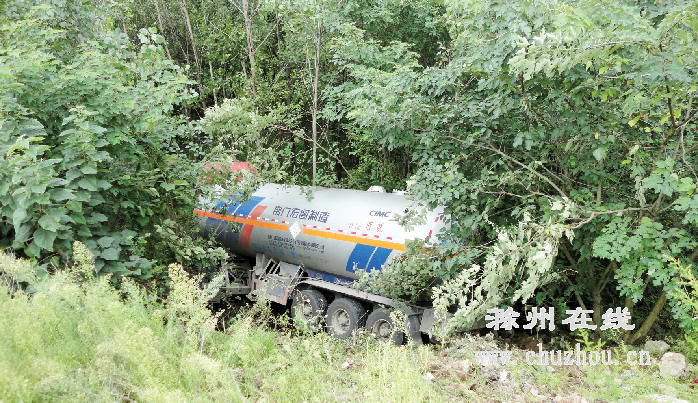 当天下午,一辆罐体标有“液氨”的空槽罐车,由滁州往定远方向行进。13时45分,行至南谯区大柳镇境内磨盘山路段时,不知何故车辆突然失控,往山沟里冲滑下去。接连撞断七八根十多厘米粗的树后,最后被卡在10多米深的山沟之中。