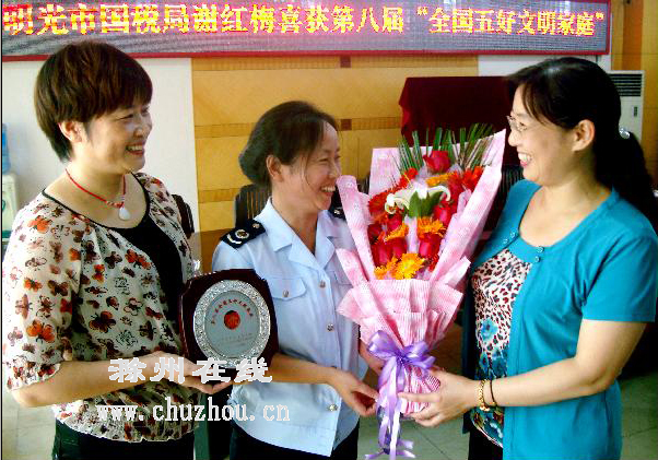 “五好文明家庭”受表彰 2012-09-11 08:00 袁松树 牛涛 摄 我要评论0 扫描到手持设备 字号: 核心提示: “五好文明家庭”受表彰 在最近全国妇联表彰的第八届全国五好文明家庭及标兵户的名单中,明光市国税局谢红梅喜获“全国五好文明家庭”光荣称号。 在最近全国妇联表彰的第八届全国五好文明家庭及标兵户的名单中,明光市国税局谢红梅喜获“全国五好文明家庭”光荣称号。谢红梅家庭是经过滁州市层层选拔出来的唯一获得者。 图为妇联负责人向谢红梅敬献鲜花及代发奖牌。 微笑 流汗 难过 羡慕 愤怒 流泪 复制网址 打印 收藏 分享到: 0