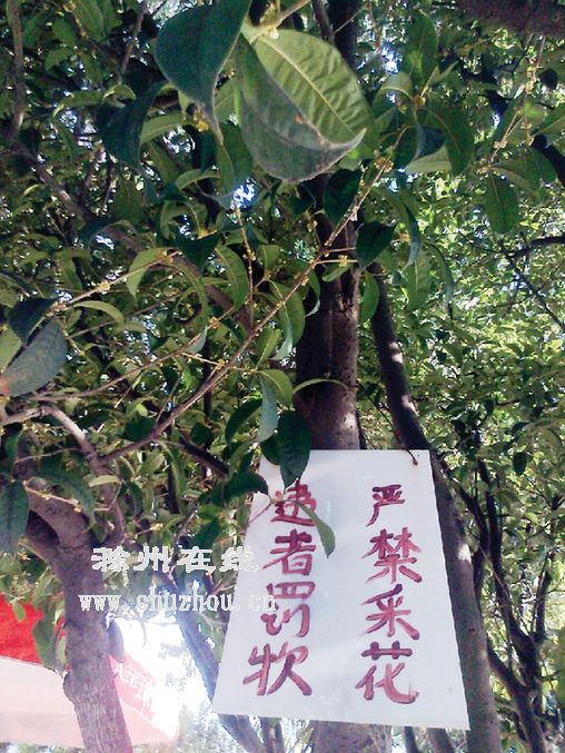 图为南湖公园银桂树下挂着严禁采花的警示牌。