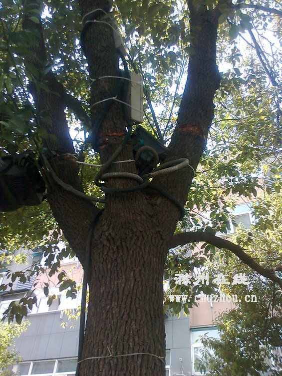 图为树身上的铁丝已经更换为塑料绑扎带。
