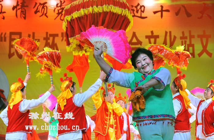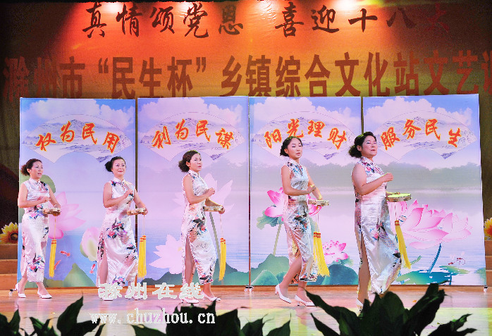 火红手绢、水绿长袖,老人们脸上笑容洋溢,舞步招式毫不含糊……一开场,琅琊区北门街道文化站选送的《好一个花鼓灯》即博得满堂喝彩。天长街道的《秀色》清新典雅,临淮关镇的《夸夸俺村喜事多》幽默逗趣,半塔镇带来的拉丁舞串烧将现场气氛推向高潮。