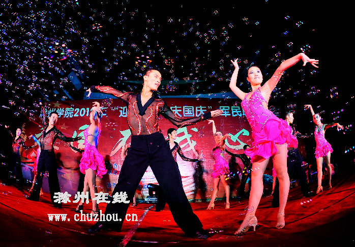 滁州:军民联欢迎国庆 2012-09-28 08:00 我要评论0 扫描到手持设备 字号: 日前,滁州学院在会峰校区图书馆前举办2012年“迎新生、庆国庆”军民联欢晚会,共同谱写鱼水情深。晚会以“祖国在我心中”为主题,共分《梦圆时分》、《时代风华》和《扬帆远航》三个篇章,来自驻滁73091部队的官兵和大学生们同台歌舞,现场洋溢着“军爱民、民拥军、军民鱼水情深”的浓厚气氛。记者 王家国摄 大学生表演体育舞蹈《激情恰恰》。 部队官兵表演军体拳。 微笑 流汗 难过 羡慕 愤怒 流泪 复制网址 打印 收藏 分享到: 0
