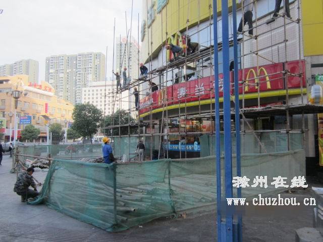 报料内容:滁城老邮电大楼十字路口,麦当劳餐厅门头上有人施工,门前人行道被占据大半。