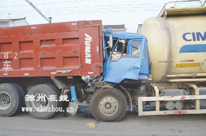 水泥罐车撞上红色货车。徐新思 摄