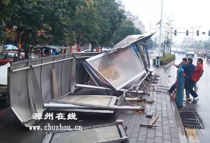 图为工人们正在将倒塌的公交站台拆除。记者 计成军摄