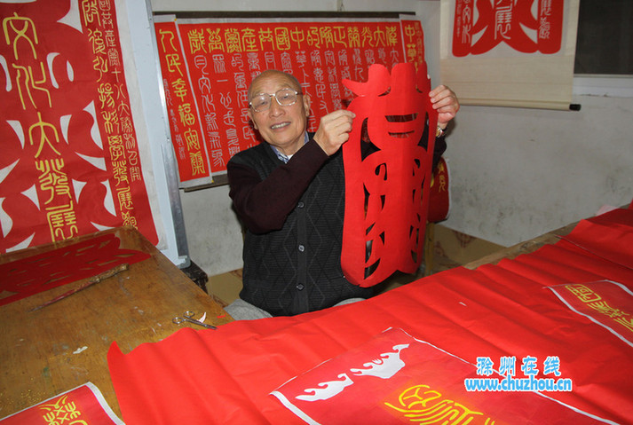 为喜迎党的十八大召开,近日,明光市73岁高龄的剪纸老艺人朱明位经过一番深思,剪出精美剪纸《一颗红心永向党》,一个巨大的“党”字为骨架,在熠熠闪光的党徽下,镶嵌了“文化大发展”五个大篆,“承前启后弘扬科学发展观,继往开来传承中华龙文化”对联附在两侧,祝贺中国共产党十八大胜利召开。图为朱明位现场展示“党”字剪纸。张子国摄