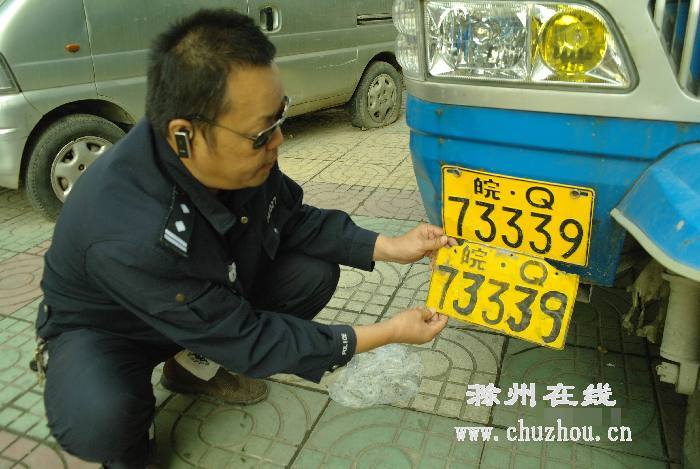 当天上午8时许,合蚌路定远县北段,一辆“皖Q73***”的三轮汽车,被民警例行检查拦下。对比前后牌照后民警发现,后面牌照数字粗糙,明显是用黑漆涂划上去的。“聪明”的是,车主将该牌照用保险杠遮挡,一般情况下不易发觉。仔细鉴别,这块牌照的真实身份是“皖Q72***”。