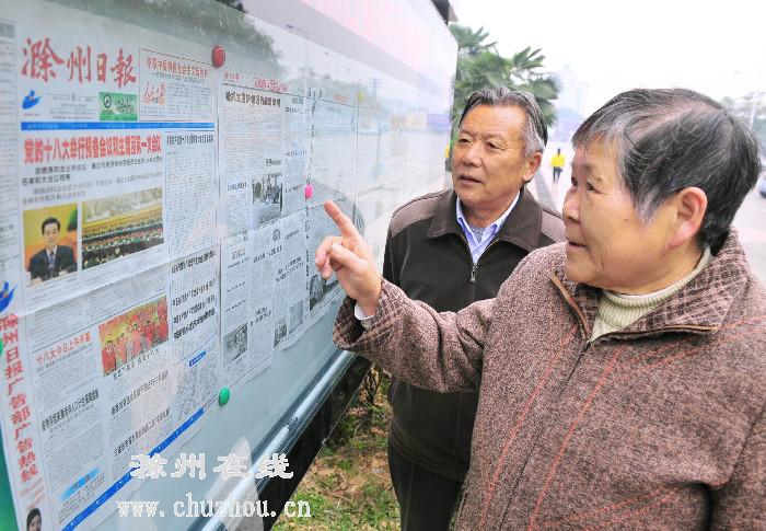11月8日,两位老人正在滁城人民广场阅报栏前关注党的十八大召开的消息。当天,由市委宣传部监制、滁州日报社承建的阅报栏正式投入使用,首批30个阅报栏分别设置在广场、公园、街道、社区等公共场所,栏内张贴每天最新出版的《滁州日报》和《皖东晨刊》各个版面。此项工程的实施,是我市文化惠民工程的一个重要体现,不仅便于广大市民读报、阅报,了解市委市政府的重大决策和工作部署,同时为市民提供丰富的本地信息和服务资讯等。记者 王家国摄