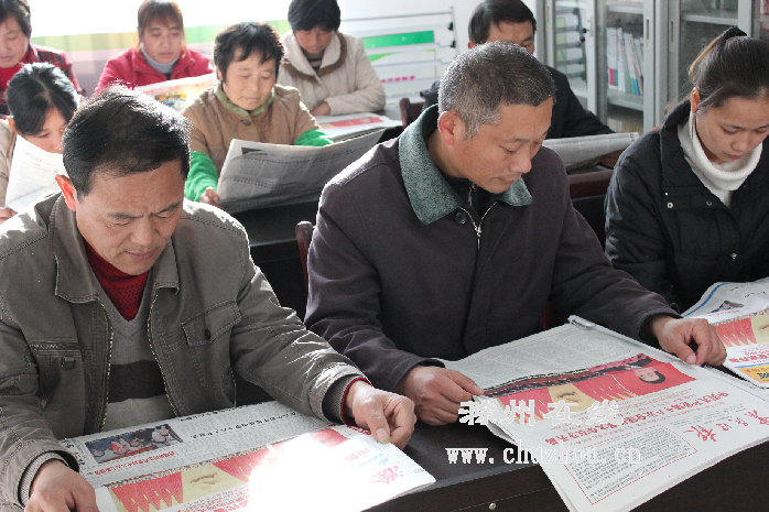 11月12日,南谯区大柳镇干部群众在综合文化站内认真学习十八大报告精神。自11月8日党的十八大开幕以来,这个镇及时将《滁州日报》等党报党刊放在显要位置并每日更新,方便山乡干群学习领会十八大报告精神,及时了解党的十八大传递出的新信息、新目标、新任务。梅天亚 董 超摄