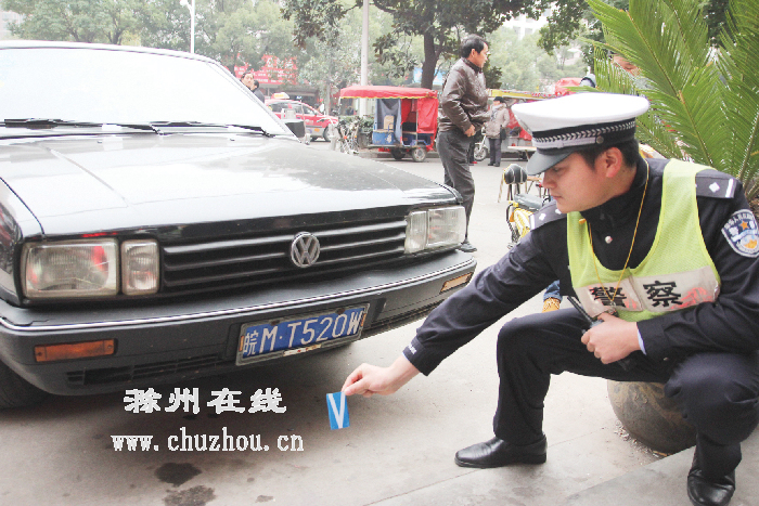 11月20日15时25分左右,市交警一大队五中队执勤民警巡逻到滁城某处时,发现一皖MT520W普桑轿车车主自制了一个字母“V”型,用吸铁石在牌照背面吸住,把前后的“5”字都遮挡,车号变为皖MTV20W,用以躲避电子眼和非现场抓拍处罚,不料被执勤人员发现。随后,执勤民警通过信息平台联系到车主,对车主的故意伪造、变造号牌行为依法进行处理。戴淮林王杰刘兴伟摄