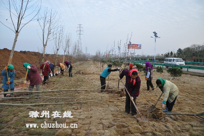 入冬以来,南谯区全力以赴加快滁宁快速通道森林长廊示范段建设。该段北起担子街道、南至南京市浦口区西葛与碧桂园交界处,全长17.5公里;建设重点内容为路基界沟外两侧各50米宽的林带建设,总面积2400亩,工程建设规划总投资为4800万元。图为绿化工作者在滁宁快通路两边美化路段。金 辉 杨 洋摄
