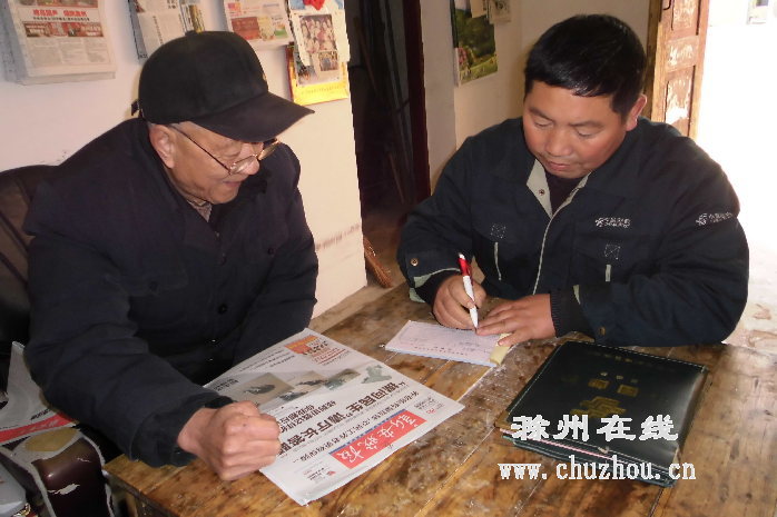 滁州:报刊征订季,乡邮员上门服务 2012-11-30 08:00 冯 斌 摄 我要评论0 扫描到手持设备 字号: 全椒县邮政局西王邮政所乡邮员、“中国好人”徐正传,近期在报刊征订的日子里,加班加点上门为当地群众订阅报刊。当地镇上的退休教师杨志文即便是生病住院时,徐正传也将老人订的报纸送到病床前。因为徐正传的服务周到细微,近年来,杨老师每年花费1千多元,将原订的3种报纸扩订到了8种,有《皖东晨刊》、《滁州日报》以及《安徽老年报》、《新安晚报》等,并年年保持。图为徐正传上门为杨志文办理2013年度报纸订阅手续。 微笑 流汗 难过 羡慕 愤怒 流泪 复制网址 打印 收藏 分享到: 0