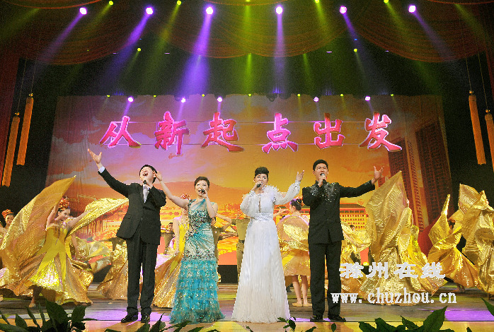 12月7日晚,省文化厅和市委、市政府在滁州大剧院隆重举行第四届文化部创新奖颁奖仪式暨第五届文化创新高峰论坛、滁州辉煌20年成就展暨座谈会文艺晚会,来自南京军区前线文工团及我市文艺工作者联袂登台,以“从新起点出发”为主题,歌唱滁州撤地建市20年来各项事业取得的巨大成就,表达全市干群共创美好明天的远大志向。图为文艺晚会演出现场。记者 王家国摄