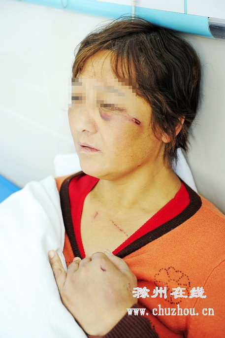 滁城李女士向本刊报料称,自己是滁城南湖公园管理处的一名管理员,7日傍晚,在制止一名老汉在公园遛狗时,惨遭毒打,“不但用棍子抽我,还把我按在地上拳打脚踢,导致我全身多处软组织受伤,左眼淤青”。