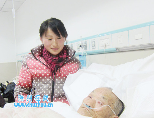 “爸,不要担心,医生说您的身体会好起来的……”11日下午,滁州市第一人民医院17楼神经科病床前,王敏鼓励着重病缠身的养父王增田。前一天,南谯区大王街道90岁高龄的王增田突然昏倒,22岁的养女王敏随即将他送往医院,并在病床前彻夜守护。据了解,为了赡养年迈体弱的养父母,王敏16岁就辍学,用柔弱的肩膀,挑起了家庭重担,即使在成家后,也不忘把养父母接到家中细心照料,以报养育之恩。