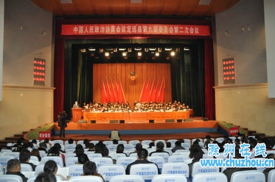 大会主席台中央悬挂着中国人民政治协商会议会徽,两边是十面鲜艳夺目的红旗,会场内悬挂着大幅标语:“科学发展,转型跨越,加速崛起,全面开创建设美好新定远崭新局面。”
