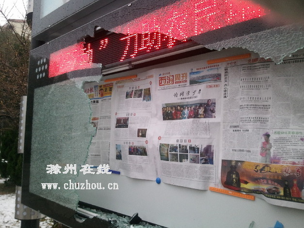 本网讯 本报一批款式新颖、设计时尚的崭新阅报栏,刚在滁城街头亮相就备受青睐,成为市民了解大事小情的一个窗口。然而就在昨天早上,滁城人民广场一个阅报栏却惨遭“毒手”,给爱读报的市民带来极大不便。