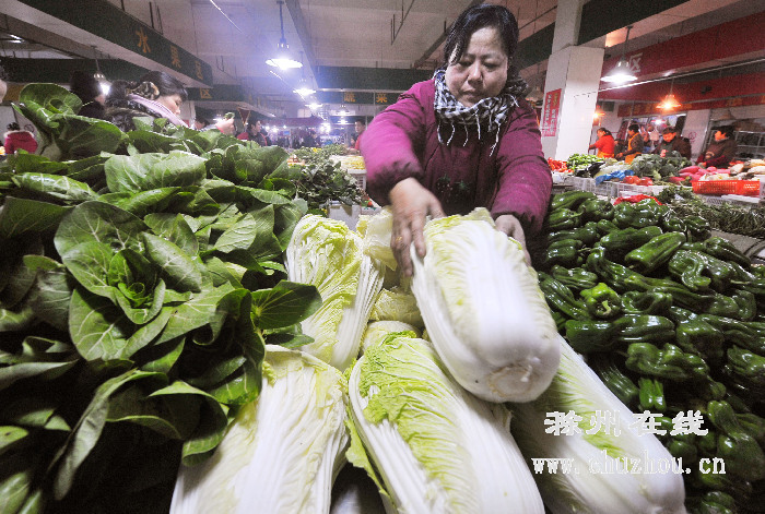 连日来,我市遭遇雨雪天气,受到天气等因素影响,蔬菜市场价格同比平均每斤上涨了0.3元,肉类、水产品、禽、蛋、奶等农副产品价格保持平稳,货物供应充足。图为市城南新区龙蟠菜市场的一位经营者正在整理货物。记者王家国摄