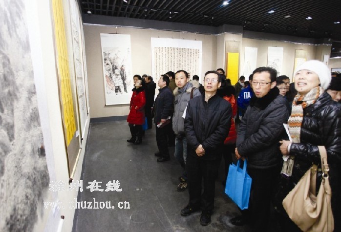 12月28日,由市文联主办的《首届滁州市书法美术摄影双年展》在滁州美术馆开展。本次展览共展出书法美术摄影作品280幅(组),其中获奖作品55幅(组),展出的书画摄影作品,主题鲜明、风格多样,兼具思想性和艺术性,代表了我市书画摄影艺术的新面貌、新成就。据悉,本次展览时间从12月28日至2013年1月2日。图为市民们在观看展出的作品。卢志永摄