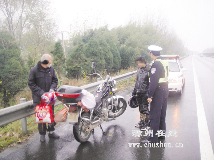 接到指令后,滁州交警高速一大队民警,立即驱车上路搜索。大约一刻钟后,在京台高速935KM处,这辆摩托车被找到。此时,摩托车和人都停在应急车道上,两人不断向来往车辆招手,请求过路司机停下。原来,摩托车因为没油才被迫停下,招手目的是为拦车借汽油。