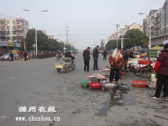 热线报料:滁城曹先生1月9日向本刊报料称,南谯北路北湖小区附近路段,不少卖鱼的小商贩竟将摊子摆到了快车道,既不安全又影响市容。