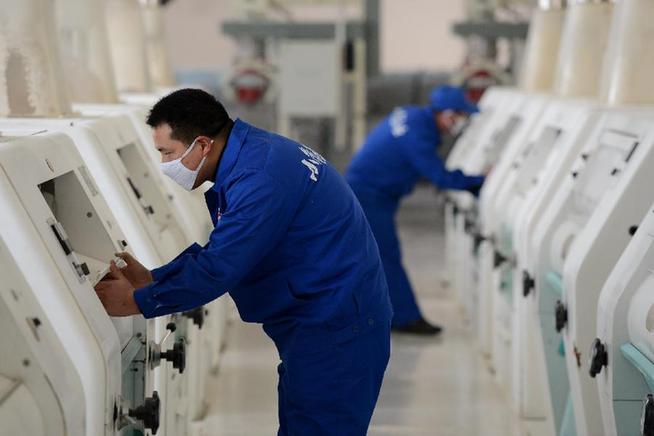 1月9日,在安徽省凤阳县小岗面业公司,工人在检查面粉的研磨情况。安徽省凤阳县小岗村结合当地实际,大力招商引资,走农业产业化发展道路,“基地+农户+订单”的产业化经营模式,既安置了农民就业,还促进了企业、农户增收。新华社发(张端摄)