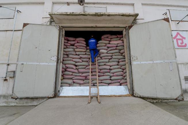1月9日,在安徽省凤阳县小岗面业公司,工人在查看小麦存储仓库。安徽省凤阳县小岗村结合当地实际,大力招商引资,走农业产业化发展道路,“基地+农户+订单”的产业化经营模式,既安置了农民就业,还促进了企业、农户增收。新华社发 (张端 摄)