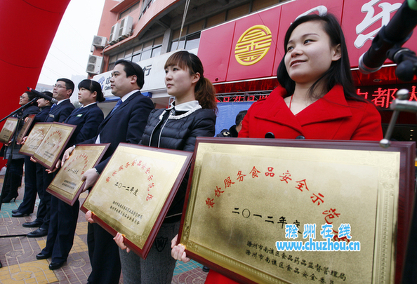1月16日,滁城中都大道各餐饮单位被南谯区食品安全委员会和食品药品监督管理局授予“南谯区餐饮服务食品安全示范街”称号,市政务中心食堂、同乐园酒店等15家餐饮单位被分别授予2012年度“餐饮服务食品安全示范店”称号。