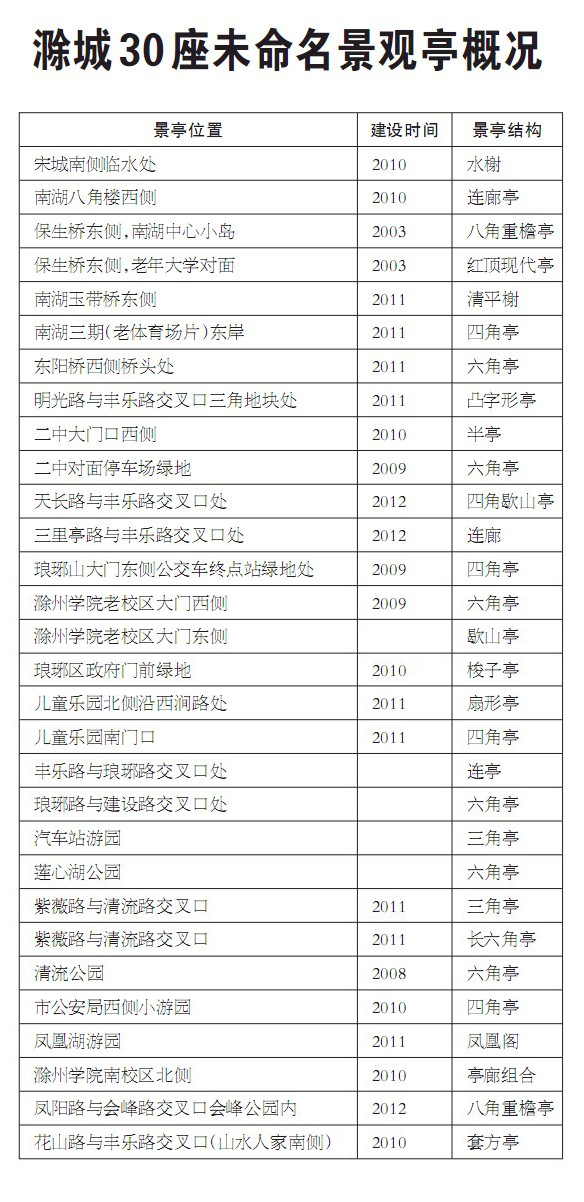 在梳理了所有的亭子后,市建委选择了他们管理的30座亭子公开征集名字。记者仔细看了30座亭子发现,大多都位于老城区,如南湖一期、二期、三期、二中西侧、琅琊山停车场、莲心湖公园、儿童乐园等。想参加评选的市民,别急着起名,可以对照着这些亭子的地点,到现场去走走看看,你会发现这些亭子都颇有特点。“除了看亭之外,还能结合周边市民的生活状态,可能更能提出更有价值的亭名。”该人士表示。