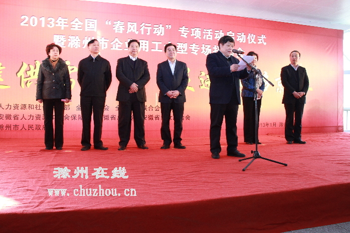 1月18日上午,由人力资源社会保障部、全国总工会和全国妇联主办的2013年全国“春风行动”在滁州市正式启动。副省长黄海嵩,人力资源社会保障部副部长信长星,全国总工会副主席段敦厚出席启动仪式并致辞。