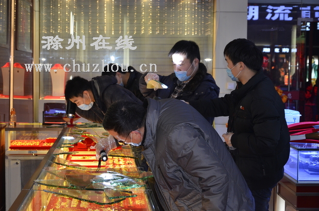 1月19日18时30分许,天长市建设西路某金店正在营业时,两名戴头盔男子闯入店内。一名男子手持尖刀,将6名店员全部赶到店内一角,暴力威胁;另一名男子抡起铁锤,疯狂砸碎柜台玻璃。