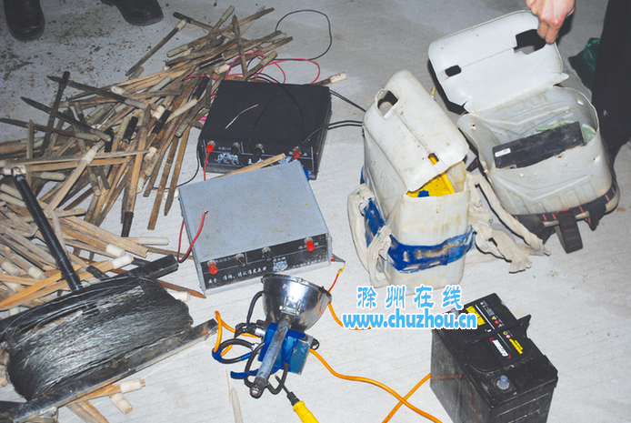 当日凌晨1时,张铺派出所几位民警巡逻到张铺镇一家超市附近时,发现不远处有两个人骑着一三轮摩托车。巡逻队员立即上前盘查,发现车内有弩、电瓶、汕气灯、电网、竹片等可疑器具,民警随即依法将两名嫌疑人传唤到派出所。