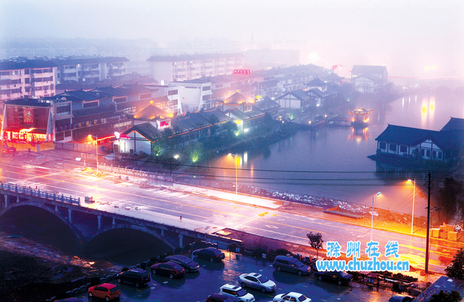 经过半年多施工,滁城古胜桥于2月1日凌晨开始通车。古胜桥位于南湖二期与四期的连接处,去年7月份开始施工。该桥设计为两跨式钢筋混凝土景观拱桥,长58米,宽24米。图为1月31日拍摄的古胜桥夜景。