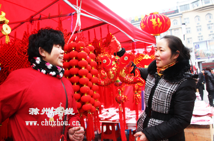 蛇年新春佳节到来之际,美好新滁城到处充满着“年味”。在城区大街小巷、车站、商场、菜场等门前,有数百个红帐篷和摊点,悬挂或摆放着大红灯笼、中国结、福字和春联等。前来选购的市民脸上绽放着笑容,祈福来年幸福。 朱永斌摄