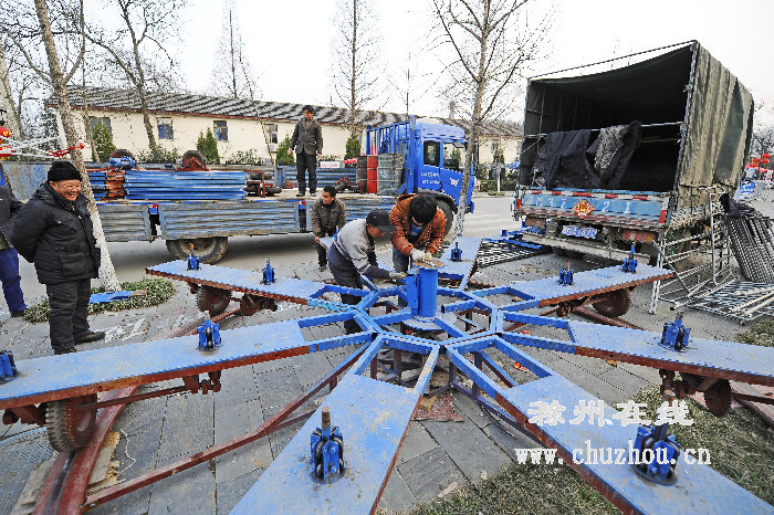 昨天下午,滁城铜矿转盘至琅琊山大门的琅琊古道两旁,不少商家已经提前占位摆摊,备足琳琅满目的商品迎接明天的琅琊山庙会,在琅琊大道与西外环交叉口处,不少卖花草树木的商家已经正式开卖,生意红火。图为一商家正在琅琊山脚下的停车场附近安装旋转木马等游乐设施。记者 计成军摄