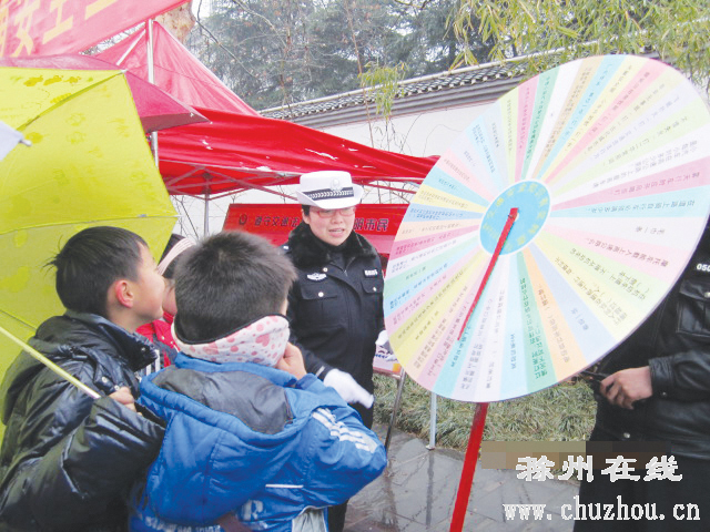 市交警支队宣传科科长周洪登告诉记者,转盘上注有交通安全常识和喜庆灯谜等题目,市民参与其中,不仅博得一乐,还能学习文明交通,一举两得。