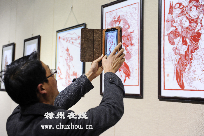 参观者在拍摄明光剪纸画。记者 计成军摄