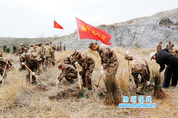 核心提示: 滁州开展“栽双拥树造八一林”活动 3月19日下午,滁州军分区协调驻滁部队、武警、消防官兵和民兵预备役人员1000余人开展美化荒山植树造林活动,植树1万余棵。