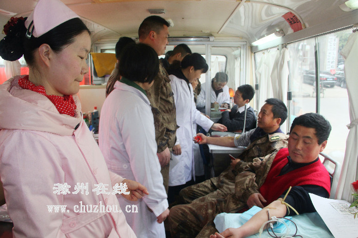 3月26日,来安县人武部机关党支部组织全体党员来到白云商厦门前的献血车上义务献血。近段时间,滁州市血库血源短缺,来安县文明办、共青团来安县委号召党团员和青年志愿者带头开展义务献血活动,县人武部机关党支部积极响应,全体党员争相参与,一次性献出4000多毫升新鲜血液。图为献血现场。何志贵摄